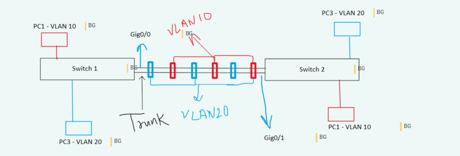 Trunk carries traffic of multiple VLANs between multiple network switches. Trunk uses the IEEE 802.1Q tag to define each frame to its own VLAN.